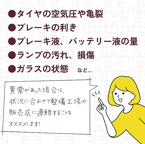 道路運送車両法(第47条など)に基づいて、「整備工場に出す前に、自分で確認するべき基本的な点検」です。
